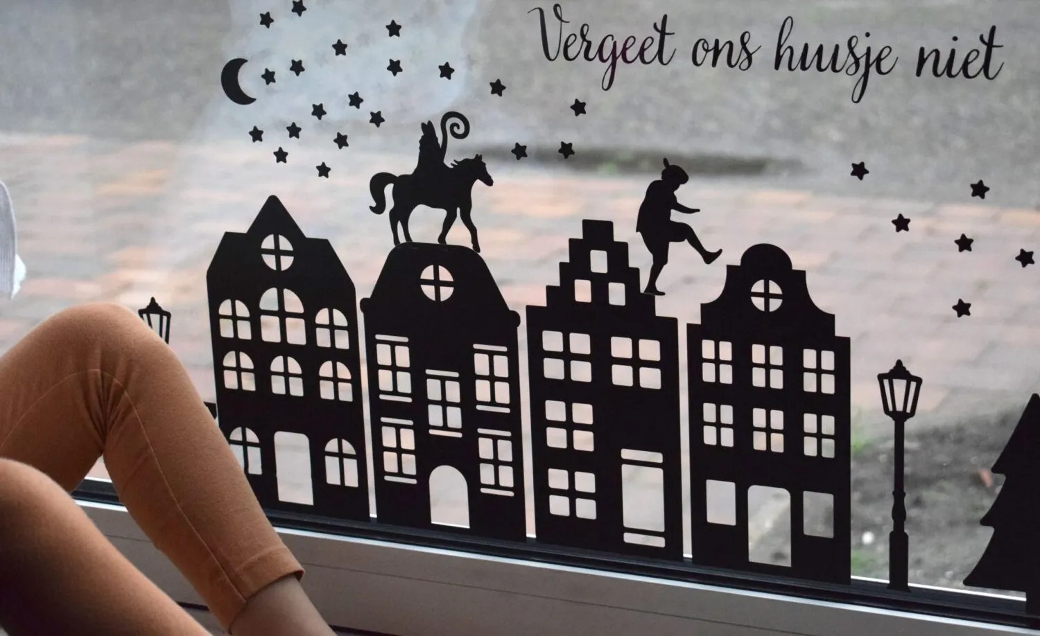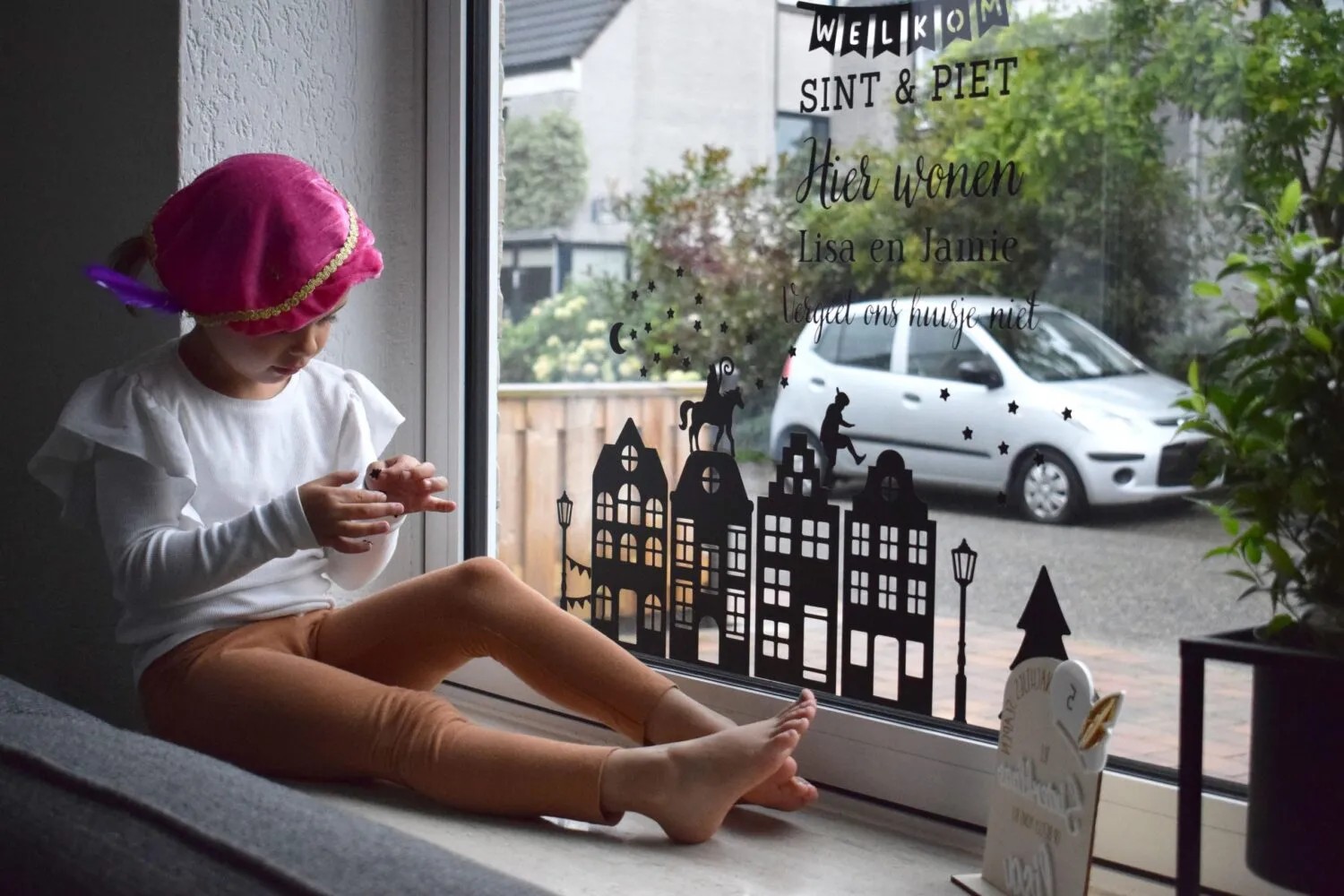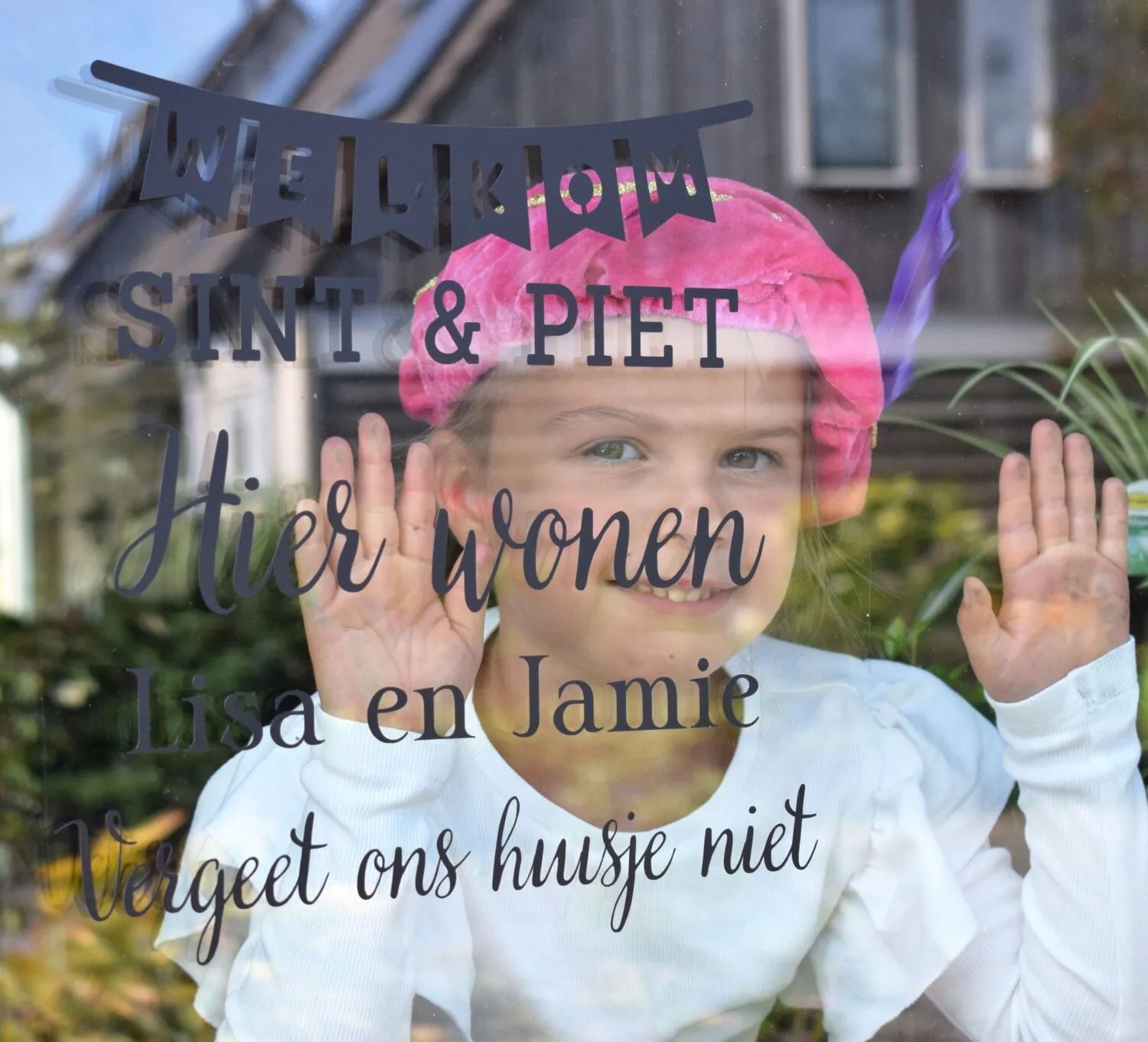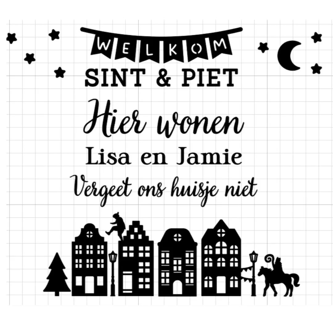 Gepersonaliseerde raamstickers vergeet ons huisje niet, alles van de foto ontvang je. De namen kun je doorgeven! Deze sticker kan alleen in vinyl.
